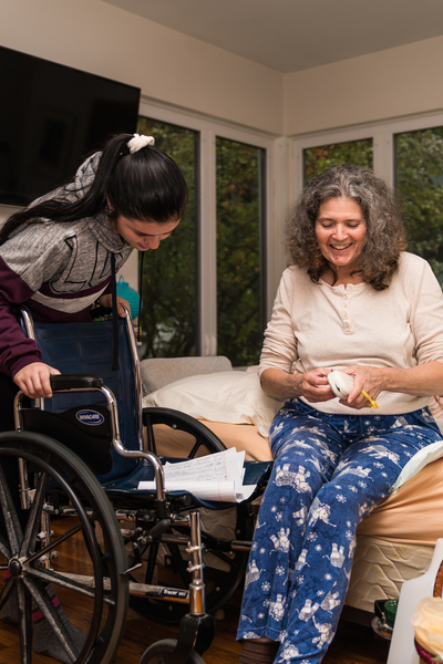 Rebecca Allen, right, laughs with her care giver, Olivia Kirk, right, in her bedroom on Hopkins Ave. in Mount Pleasant, Mich. on Sunday, October 28, 2018. Kirk has a list of chores that Allen gives her to do each time she comes over. These chores usually consist of cleaning and preparing food.