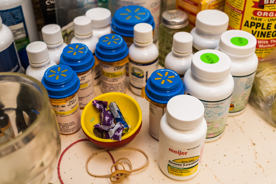 Pill bottles on the counter in Rebecca Allen's kitchen on Hopkins Ave. in Mount Pleasant, Mich. on Wednesday, November 14, 2018. Allen has to take over a dozen pills a day to control the lasting symptoms of her Lyme disease.