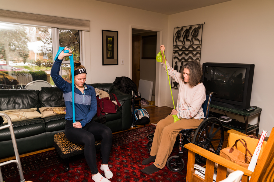 Rebecca Allen, right, performs physical therapy with her care giver, Amber Chapman, left, in her home on Hopkins Ave. in Mount Pleasant, Mich. on Sunday, November 18, 2018. "I try to do at least 50 minutes of physical therapy a day, but it's a good day when I get through it all," said Allen.