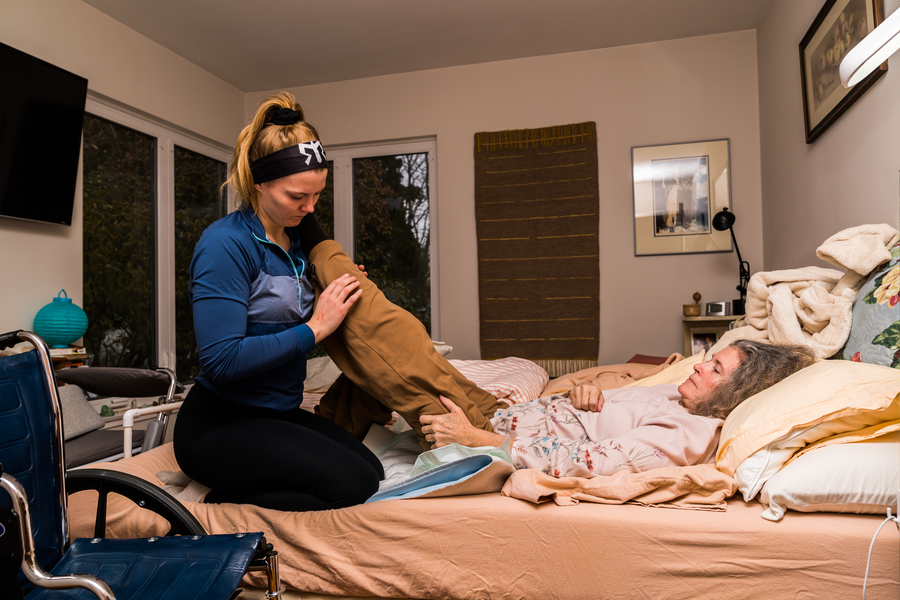 Amber Chapman, right, helps Rebecca Allen, left, put on her shoe before doing physical therapy at her home on Hopkins Ave. in Mount Pleasant, Mich. on Sunday, November 18, 2018. Allen tries to stand at the kitchen sink every day for at least a few minutes while one of her care givers are present.
